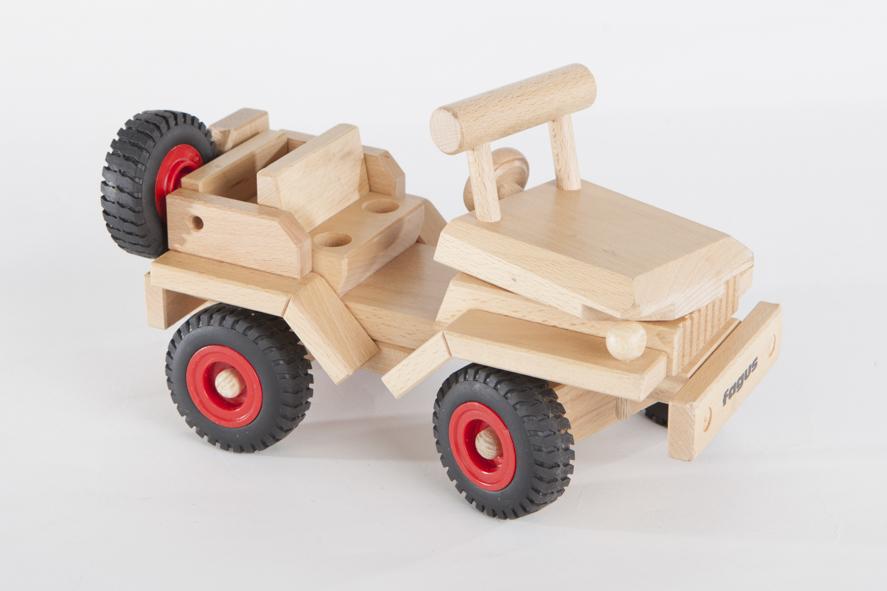 As with all Fagus toys, the Fagus Jeep is hand-made in Germany out of solid beechwood ("Fagus" is Latin for beech) and does not contain any nails, screws, or staples. Even the most complex Fagus vehicles are made by interlocking, doweling, and/or gluing wood together by hand. Many of the Fagus vehicles have won the "Spiel Gut" good toy award, which signifies that a toy meets the highest standards for play value, educational value, the material used, workmanship, construction, durability, safety, design, size, quality of the instructions for playing or making and suitability for the appropriate age group.