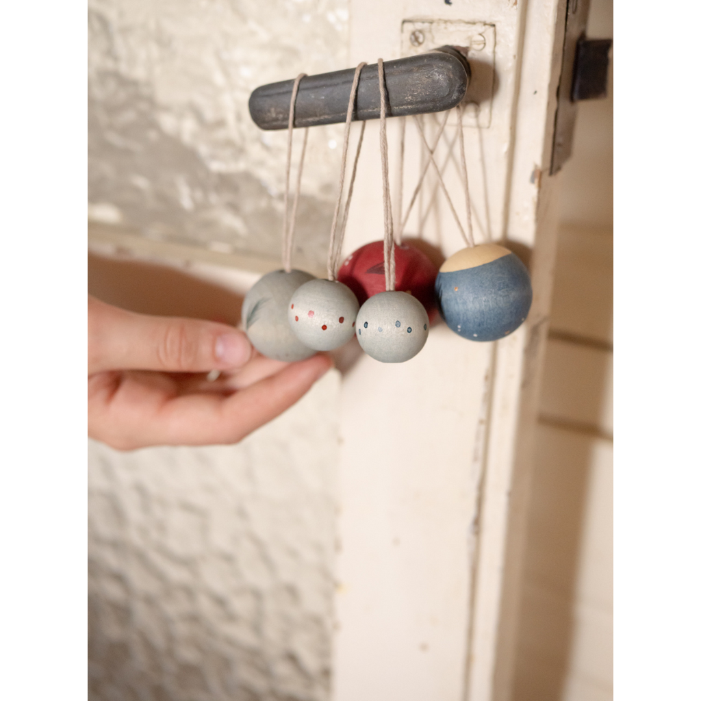 5 pieces with spheril shape, painted by hand. Includes thread for hanging. From 25mm ø to 40mm ø